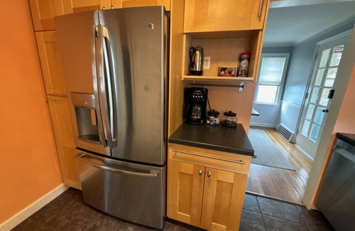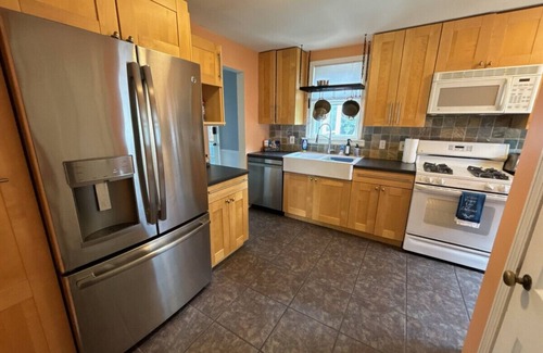 As soon as you walk in, you'll be taken in by the lovely front room with wood flooring and a large fireplace. Relax in the comfortable furnishings and enjoy a show on the extra-large 70" Smart TV. Step into the dining room where you can gather the family for a meal, with seating for six. The kitchen has newer appliances, beautiful wood cabinetry and all the amenities of home. Upstairs you'll find the three bedrooms, all with wood flooring. There are two comfortable queen bedrooms (each with Smart TVs) and a full bedroom (plus there's a full-sized futon for another guest). And the full bathroom is stocked with towels and toiletries for your comfort.