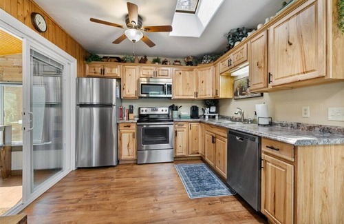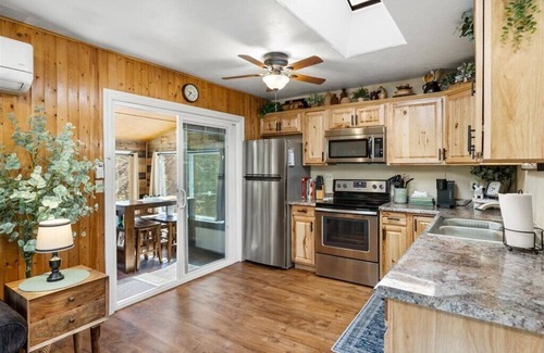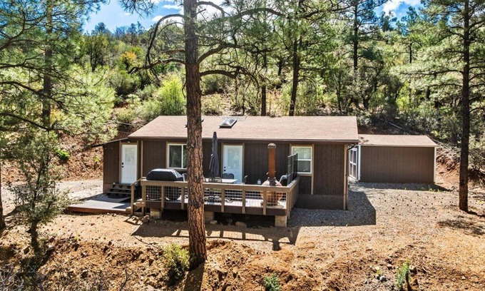 Welcome to this delightful cabin in Prescott. This charming retreat features 2 soothing queen beds, a cozy bathroom with a shower, and essential amenities like WiFi and AC. Guests can unwind in the serene surroundings or explore the local attractions. Experience what Prescott has to offer with a stay at our cabin. Nestled in the Prescott National Forest with access to three different hiking trails and seated above a seasonal creek. Fenced deck and additional sunroom gives a variety of places to relax. Full kitchen with everything you could possibly need! Keurig coffee pot and K-cups are provided. Calm and serene with views of the forest. Dog friendly too!