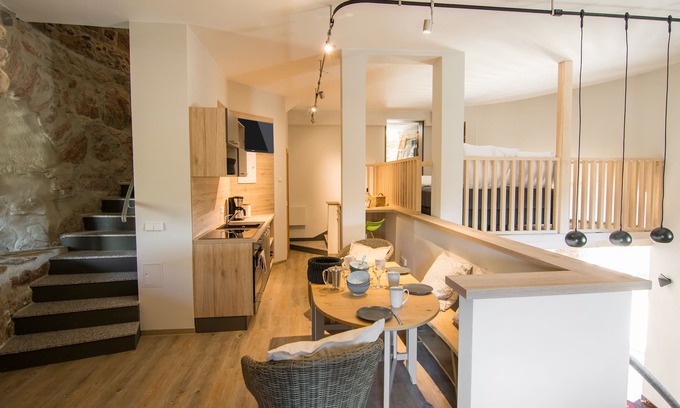 The eight-person apartment is distributed over the lower 3 floors of the Mühlbastei in Bautzen. 2 bedrooms, 3 bathrooms, an open gallery with 2 beds and two kitchens extend over 120m² and offer families or groups of friends a spacious holiday experience with sufficient privacy. On our 22m² terrace you can have breakfast together or end the evening with a glass of wine. We invite you to an unforgettable experience with your loved ones in this 500 year old building.