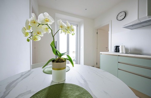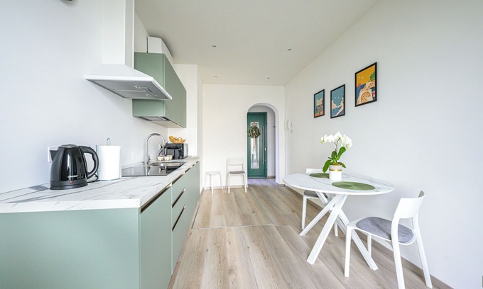 This 2-bedroom, 1-bathroom rental features air conditioning and a desk. Bathroom amenities include a hair dryer, a bidet, and towels. The kitchen is equipped with a stovetop, a refrigerator, and a dishwasher, as well as an electric kettle, a microwave, and cookware.