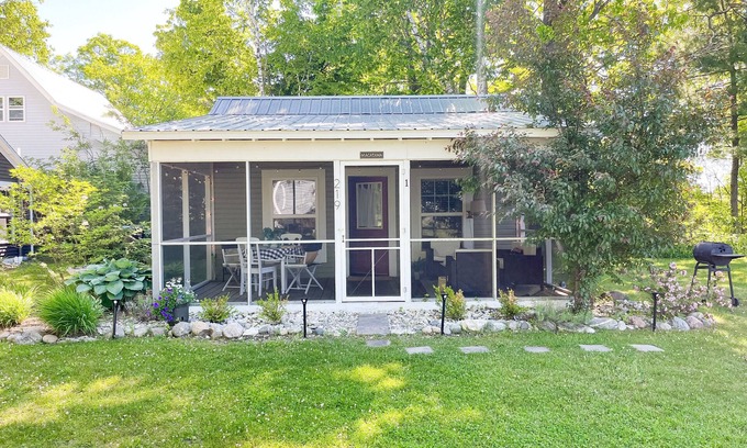 A one bedroom bright and cheery cottage which is one of 3 on this property. It is walking distance to town. The focal point is the large screened front porch with a table and chairs for dining, and a wicker loveseat and chair for relaxing. Its the perfect place to unwind after a busy day of sight seeing or to sip a cup of coffee in the morning. The kitchen has everything you need to cook any meal. And the full bathroom has a shower/tub combo. The bedroom has a queen bed while the living area has a full size sofa bed. TV/cable and internet are included, with games and books for your enjoyment also. It is a short walk to town and to the Straights. (The cottage is not waterfront). And a quick drive gets you to the Headlands Dark Sky Park, sandy beaches, and the UP. We feel this is ideal for 2 people, but can sleep 3 or 4 if really needed.