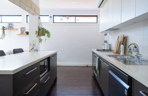 The kitchen and living space is open plan, designed around a central breakfast bar where guests can take things slow over their morning coffee. Stock up on fresh produce at Petes Organic Market next door and whip up meals at home using the modern appliances in the full kitchen and compact kitchenette, or out in the courtyard on the BBQ. A comfortable sofa and TV with Netflix ensure cosy nights in, while a dedicated reading nook upon entry encourages you to kick back with a good book.