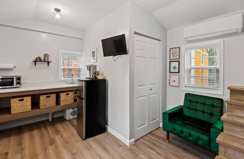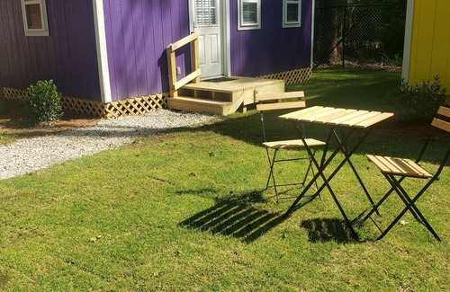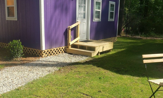 This cozy tiny house is located in a family-friendly area in Notasulga, and is ideal for up to two guests to relax in a Tiny Village. Inside is queen-size bed appointed with soft bedding and linens to ensure a good night's sleep. Comfy chairs to kick back in front of the TV, the ideal way to relax after an action packed day. Guests can enjoy the communal areas, where they can play indoor games and outdoor games, as well as spend time with others around the fire pits. This tiny house is a part of a tiny village inside a fence with keypad access. SEE PICS FOR STEPS. This is a tiny house so hot water tanks are small. Hot water may be limited but heats back up quickly. Wifi may be spotty due ro our rural location. Thank you and I would love to invite you to