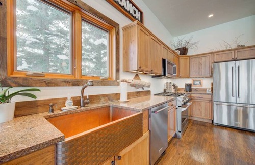 Inside the Madison River Houseyou will find an open concept living, dining and kitchen area with vaulted floor to ceiling windows overlooking the Madison River and the Madison Mountain Range beyond. The front door opens to the spacious living room offering a mounted smart tv, large stone fireplace, corner couch, bar and reading area all overlooking the private backyard. Steps away, the dining area offers a large table with seating for 10 people. The expansive kitchen is open to the living and dining area and is outfitted for any chef. A six burner gas stove, large coper sink, stainless steel appliances make meal time enjoyable. The kitchen island offers an additional sink and bar seating for three. A large laundry room off the kitchen with additional counter space, sink and washer and dryer allow for light packing on your vacation. The rest of the main floor includes the primary bedroom, a guest room, office and hallway half bathroom.