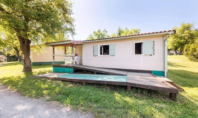 Details: Disabled access Wi-Fi access : free on the entire campsite Playground for children : (swinging, trampoline...) Deposit (in supplement) Baby chair : 14€/week - upon reservation and subject to availability - to be paid on site Deposit of bread : cooked on site and delivered to location Laundromat : see on-site rate and settlement Bedding : 13€ / bed - upon reservation and subject to availability - to be paid on site Crib : 38.50€/week - upon reservation and subject to availability - to be paid on site Final cleaning : see on-site rate and settlement Number of stars : 3 Car park : Only 1 vehicle authorized per rental, no extra charge possible. (Moto and small trailer tolerated) bowling Ping Pong Swimming pool : outdoor heated - open from 01/06 to 15/09 according to weather conditions (at opening hours to be consulted on site) Snack bar : opened from 01/07 to 30/08 Tourist tax (surcharge) : see on-site regulations and tariffs Environmental display Charging station for electric cars : piloted via the chargingplus app - see rate and on-site regulation PMR Access Pets Allowed : 24.50€/rental - only 1 animal / dwelling - categories 1 and 2 prohibited - to be settled on the spot Deposit (in euros) : 340 Number of bedrooms : 2 Number of pieces : 3 Number of toilets : 1 Number of bathroom : 1 Cooking plate Fridge Garden Lounge Surface (m²) : 33 Terrace Dishes and cutlery