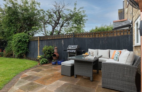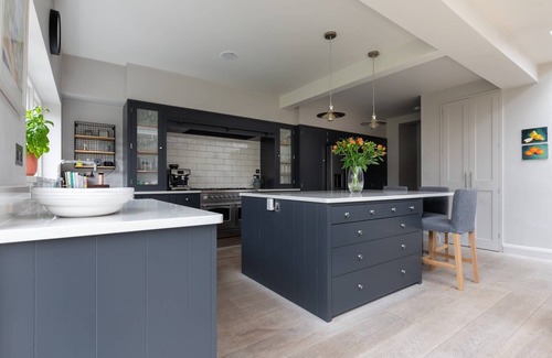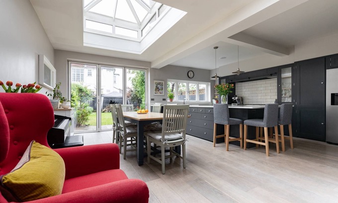 Magdalen Road is a contemporary home with a large private garden, ideally suited to large family and friend groups of up to ten. Tucked away in leafy Wandsworth, a direct train from nearby Earlsfield Station whisks you into Waterloo within 15 minutes for effortless access to Central London. Enjoy a laid-back, suburban location while still having the capital’s hotspots within easy reach. With its scenic parklands, play parks, and walking paths, Wandsworth is perfect for families. The open spaces are ideal for a picnic on a sunny day, while exhibitions at the illustrious DeMorgan Centre and live music in Wandsworth’s bars keep everyone entertained. Earlsfield High Street is brimming with lively pubs and cafés, with an international dining selection. Old York Road, a short walk from Magdalen Road, offers boutique shopping, artisanal bakeries and delicatessens, and pretty al fresco brunch spots. After busy days in the capital, retreat to the stylish comfort of Magdalen Road. A bay window floods the refined living room with natural light. Curl up on a plush sofa for a movie on the large TV or enjoy a game of chess beneath the statement chandelier. A second living room provides a snug space to unwind and works perfectly for families with children. A handsome and well-appointed kitchen boasts all the latest appliances and opens onto a sunny dining area for informal feasts. The secluded garden can be accessed from here, offering seamless indoor-outdoor entertaining. Magdalen Road accommodates guests across five exceptionally stylish bedrooms. The primary suite sits on the top floor and impresses with its sophisticated graphite colour scheme and super king-size bed. The chic ensuite features a walk-in waterfall shower. The four other bedrooms share an elegant bathroom with a deep soaking tub, elevated by antique gold accents. Three of these bedrooms offer a cosy double bed and a king-size bed is found in the other. Discover a neat work desk in the bay window of the second bedroom, ideal if you need to work during your stay.
