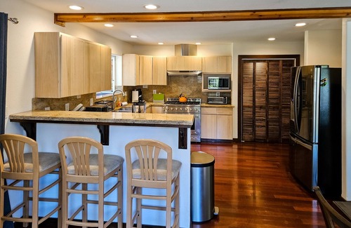 Step outside to discover a basketball court, a huge yard with a kids' play structure, and lush greenery surrounding the property. Follow a winding path to a serene spot with a water feature/koi pond. There is a hot tub where you can experience ultimate relaxation and a firepit for roasting smores. Listen to the birds chirping and the waves crashing from the nearby ocean, creating a tranquil ambience that is truly special.