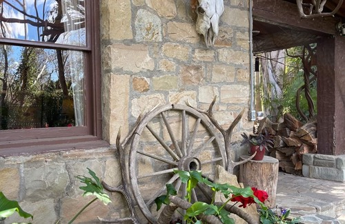 This unique house was built with all natural resources the result is a quite distinctive habitat that makes a strong visual impact. The House was constructed entirely of stone. Trees have been creatively crafted as bars, benches, beams, art, mantels, and just decorative forms. The property has 3 separate structures that are all included. The Main Houses / Buffalo Cottage / Bunk House. It is enchanting to wander the many winding paths of lush palms that connect each one to each other. The heart center of the RTR Ranch boasts a lagoon inspired shimmering black bottom pool and extraordinary entertainment area. The dinning area for (10-12) makes a magical setting like no other for that special gathering. Delight in warming by the massive rock fireplace that keeps the natives cozy at night. Additionally along side the pool is a magical rock & thatched Tiki Bar and a gigantic Santa Maria style wood fired BBQ that invite long afternoon barbecues to linger into evenings. Unique to this property is 2 soaking tubs offered in opposing locations. Taking a long soak in the jungle spas nestled in the opulent gardens is one of the most memorable experiences to bring you back to center. As though you were at a fine resort, a plentitude of outdoor seating, hammocks and chaise lounges connect you to poolside activities. Various dining and seating areas dot the luscious landscape. An intoxicating mix of rustic chic & tropical hideaway – one feels as if they have stumbled upon a jungle-swimming hole Rolling Thunder Ranch is considered an enchanting horticultural treasure of Ojai.