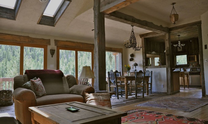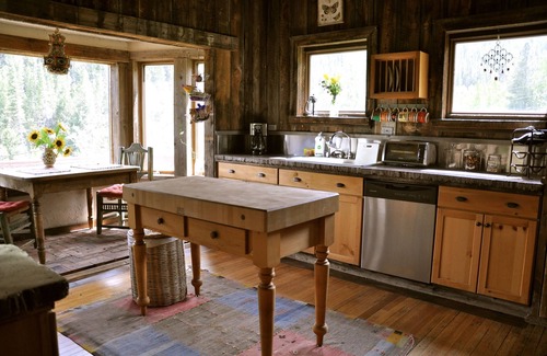 We remolded this historic cabin in the late 1990's, but not without first falling in love with the wonderful character and imperfections of this turn of the century structure. We purposely kept what we could, like the original hardwood floor, and took great care to salvage and recycle as much of the original, weathered materials, and then integrated them back into our home. Though 100 years old, our cabin offers the comfort of all the modern amenities, while preserving it's rustic charm in a uniquely, eclectic style. Reclaimed, hand hewn timbers accent the the cabin exterior, the master bedroom, and the one of a kind, rustic, hand poured bathroom. Hammered metal details and homemade doors add a wonderful, hand made touch throughout. Furnishings and decorations artistically blend textures from around the globe, as well as from local artisans, all of which enhance the uniqueness of your stay.