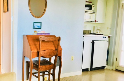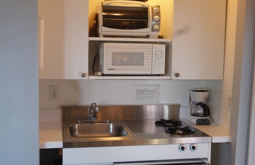* Fully equipped kitchenette with cooktop, microwave, countertop oven, and refrigerator