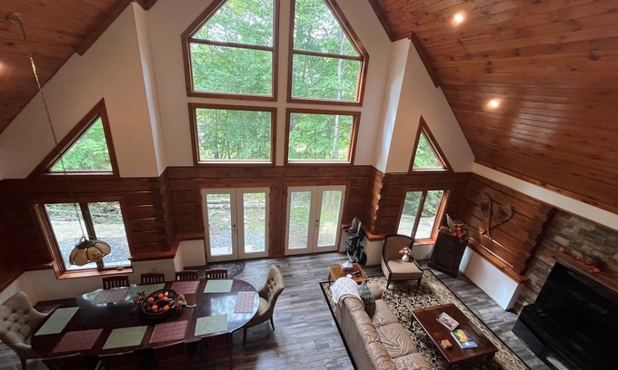 You'll love spending time in the expansive living room and dining rooms, featuring cathedral ceilings and a fantastic view of the changing forest throughout the seasons. Furnished for comfort, the living room also includes a large pull out couch, a beautiful woodstove and an electric fireplace, and a 75-inch smart TV where you can bring your own streaming device, plus with Netflix available for guests. Adjacent to the dining area is a games room with an air hockey table, dart board, yoga mats and access to the outdoor hot tub.