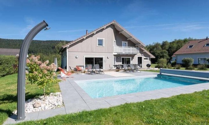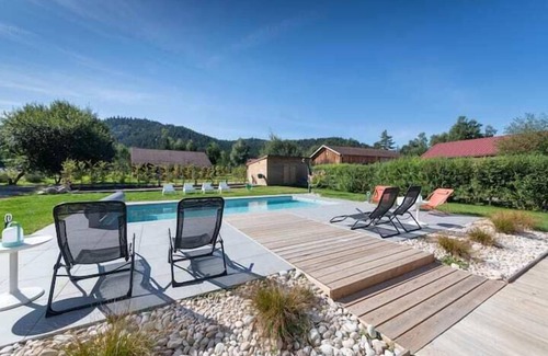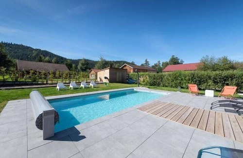A quelques minutes en voiture du lac de Gérardmer, du centre-ville et des pistesski, Magnifique chalet, avec une grande piscine creusée et chauffée (8*4) ouverte en saison environ de mai à octobre.