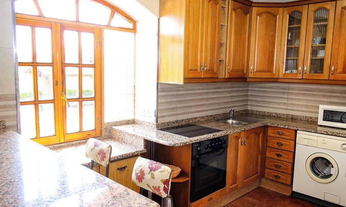 The kitchen is fully equipped with everything you need, washing machine, microwave, refrigerator, oven, utensils...etc.