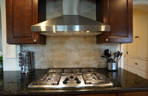 Tumbled Travertine Floors in Versailles Pattern In Kitchen Areas