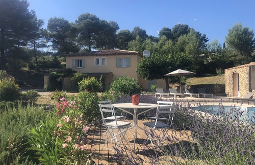 This stunning villa is situated one kilometre from the perched medieval village of Flayosc in the department of the Var. 90kms from Nice Airport and 130kms from Marseille Airport. The village has 8+ restaurants, and also has shops and bars. With lovely gardens, a large shady dining terrace and uninterrupted views this roomy villa offers a large family or two or three families holidaying together a charming peaceful retreat yet within walking distance of a lively, typical Provençal village.