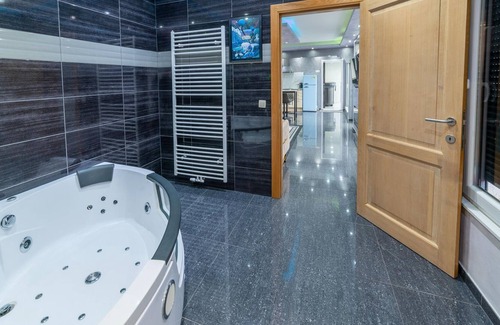 Layout: Ground floor: (hallway, Living room(double sofa bed, fireplace, decorative fireplace), dining room(dining table), Kitchen(electric kettle, cooker, espresso machine, oven, microwave, fridge-freezer), bathroom(shower, washbasin), fitness room(fitness equipment), Bubble bath) On the 1st floor: (bedroom(double bed), bedroom(double bed), bedroom(double bed), bathroom(massage shower, washbasin), Turkish steambath) infrared sauna, air conditioning, terrace, BBQ, BBQ, private indoor pool