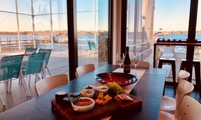 Just outside the glass doors from the kitchen, there is a HUGE screened-in deck with an additional outdoor dining area that can seat 8 or more (additional folding chairs are available, upon request). This deck, on the back of the house, overlooks the lake and connects to a raised walkway that leads to the water's edge and boat dock.