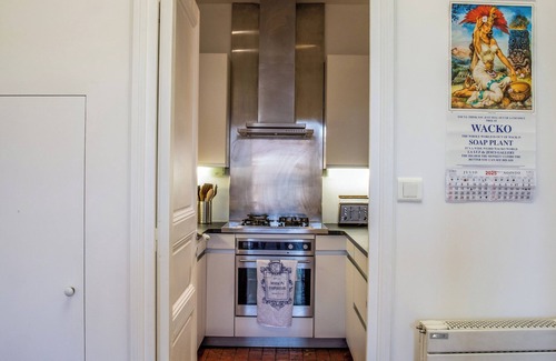 The three spacious bedrooms have comfortable beds (one bed is 160 x 200 cm and the other two are 140 x 200 cm). There are two bathrooms, one for each side of the apartment, so couples and families can enjoy complete privacy during their stay. The master bathroom has the original sink, bathtub, and shower with their original fixtures from the 1920s, all of which still function.