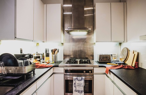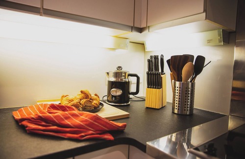 The fully equipped kitchen features a three-burner gas stovetop, refrigerator/freezer, dishwasher, microwave oven, electric kettle, 4-slot toaster, a Nespresso coffee maker and a French press for ground coffee. Basic spices (salt, pepper, olive oil, harissa, etc.) are provided, along with a full complement of pans and baking dishware, plates, bowls, glasses & coffee mugs, wine glasses and silverware.