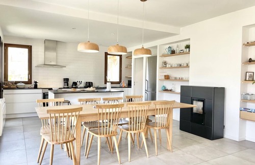 Built entirely of stone and wood, this chalet has the charm of traditional chalets while offering the comfort of a contemporary house with large spaces, large bay windows, and a magnificent view of the Pyrenees. Decorated in a Scandinavian style, and in a mountain spirit: shades of white, gray and natural wood.