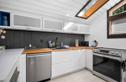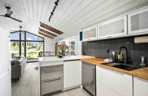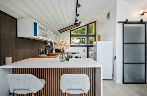 Every detail in the home has been thoughtfully upgraded to create an experience that is both serene and also tech-forward. Enjoy modern conveniences such as heated floors and therapeutic shower panels in both bathrooms, hands-free flushing toilets, and touchless kitchen faucet. For those that need to plug in, the house is also equipped with high-speed internet, making remote work a breeze from the sit-stand desk in the second bedroom. And when you're ready to recharge, you can treat yourself to a coffee, latte, or espresso at the touch of a button with the on-demand machine.