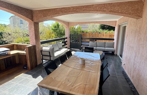 A covered terrace with dining table for 8 people, a lounge area and plancha area