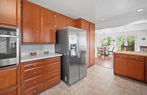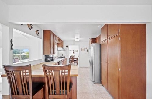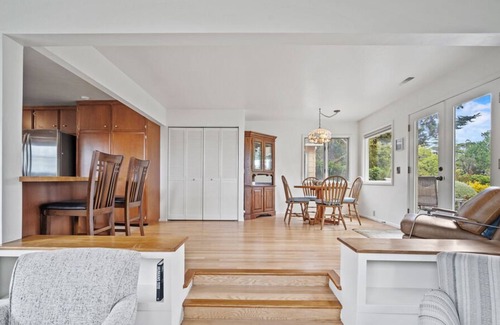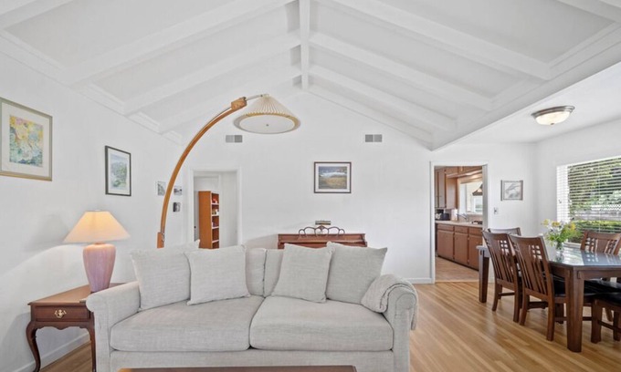 Relax under the magnolia tree and watch the wildflowers grow from the shared backyard (the cottage behind the garage is rented separately).The central location of this 3-bedroom, 2-bath home allows easy access to all the splendors of Carmel—from downtown shops, galleries, and restaurants to hiking trails and beaches.It’s all on one level except for a step-down den with a large TV, fireplace, two swivel chairs and a leather loveseat. The main living room features a second fireplace and a piano, the dining area seats six, and the kitchen has quartz countertops, a 5-burner gas cooktop and stainless appliances. French doors in the breakfast nook open to a deck facing the backyard.The master suite (King bed) has a private bath with a shower and a jacuzzi tub; the second guestroom has a Queen, and the third has two Twins. Both bedrooms share a hall bath with a stall shower.Driveway and street parking. Note: The back cottage has a long term tenant and is not part of the rental. CarmelTOT certificate: 002279