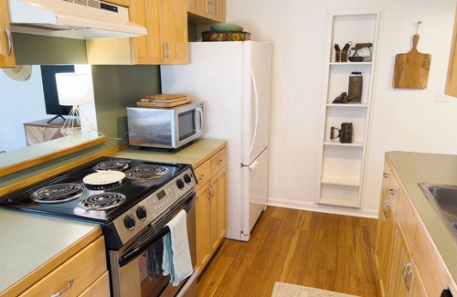 Start the day with a cup of coffee and a view of the front garden through large east-facing windows. Or, for a night in, a 55” 4K smart television has all of the apps (Netflix, Hulu, Max, Prime, etc.) ready for your entertainment. The new, modern (no bar in your back!) pull-out couch offers an additional queen bed for 2.