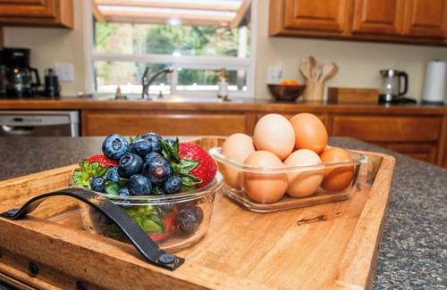 The kitchen is a blend of modern convenience and rustic charm. It is equipped with state-of-the-art appliances, including a dishwasher, microwave, and oven, ensuring that guests have everything they need to prepare meals. The wooden cabinetry and beautiful countertops add a warm and welcoming feel, while the spacious layout provides ample room for cooking and dining. Whether guests are making a quick breakfast before heading out for the day or cooking a gourmet dinner, they'll find the kitchen more than accommodating. Tea and coffee is also provided to our guests.