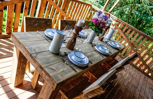 · Outside space: Each tent has it's own private balcony with outdoor seating and a gas BBQ. There are stunning views across the valley. The lodges are set in 8 acres of historic gardens which you are free to explore with ponds, woodlands and a communal play area. The play area has a large trampoline, a table tennis table, a small football pitch and a large slide and swings.