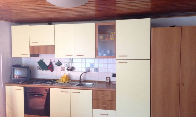 In the two-room apartment there is a bedroom in walnut and cream, with double bed, six-door wardrobe, chest of drawers and bedside table; 2 balconies; a living room with fitted wall, 6-seater table, double sofa bed; Two single beds; the kitchenette has a wall of 3 linear meters, with oven, fridge. It is equipped with flat pots, there are hairdryer and iron, TV, fan, blankets, sheets and towels on request.