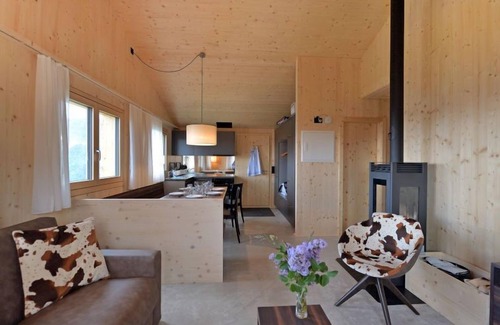 "Maiensäss Superior", 3-room chalet 58 m2, south-east facing position. Comfortable and cosy furnishings: living/dining room with 1 double sofabed (140 cm, length 200 cm), Scandinavian wood stove and satellite TV (flat screen), radio. Exit to the terrace. 1 double bedroom. 1 room with 2 beds. Open kitchen (oven, dishwasher, 4 ceramic glass hob hotplates, electric coffee machine, Capsules for coffee machine (Nespresso) extra). Shower, sep. WC. Electric heating, wood heating. Terrace, south-east facing position. Terrace furniture. Very beautiful view of the mountains, the valley and the countryside. Facilities: safe, children's high chair, baby cot (extra). Internet (WiFi, free). Parking (2 cars) at the house. Suitable for families. Maximum 2 pets/ dogs allowed. Heating wood (as required/extra). Please note: Pets must be registered when booking. Aclas Heinzenberg SA only has a limited number of such pet houses. If pets are not registered in advance, the landlord cannot guarantee that a house will be available on site.