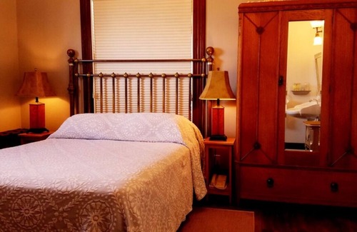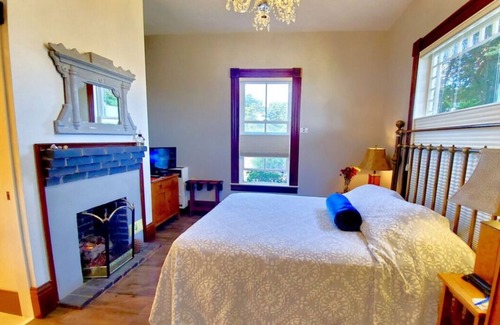 This first-floor guestroom has large Queen Anne cottage-style windows, vaulted ceilings, and a queen bed decorated with a brass bed frame. Contrasted with oak antiques, old-growth redwood trim, an original fireplace, and a chandelier.