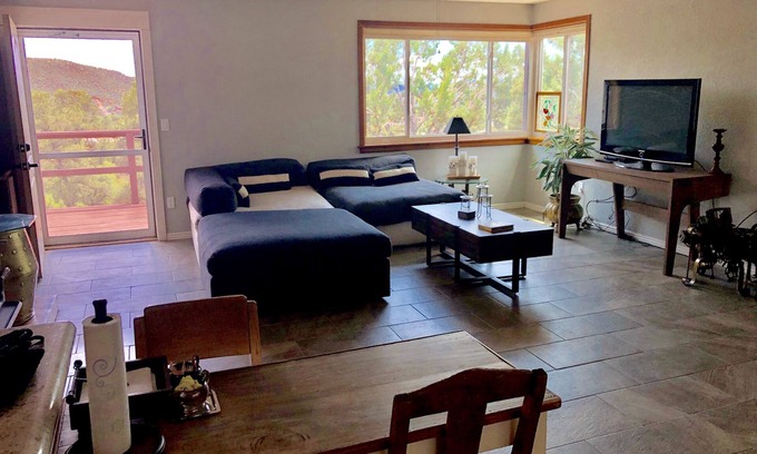 The Main house in the heart of Sedona boasts a spacious living room, two queen-sized beds, and two additional twin mattresses, accommodating both you and your loved ones comfortably. Step outside onto the large patio or relax on the private upper deck, which offers 360-degree views of the majestic mountains—perfect for post-wedding relaxation. You'll also find a charming atmosphere filled with unique character, plus amenities designed for leisure, ensuring that your stay remains enjoyable as you celebrate love.