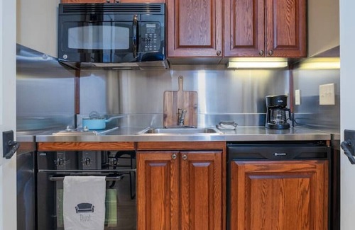 In addition to the open concept loft, the apartment has a separate bedroom with a queen bed and two full bathrooms. The loft has a kitchenette, where you can enjoy a relaxing evening in, cooking a delicious meal and enjoying it in the comfort of your own space.