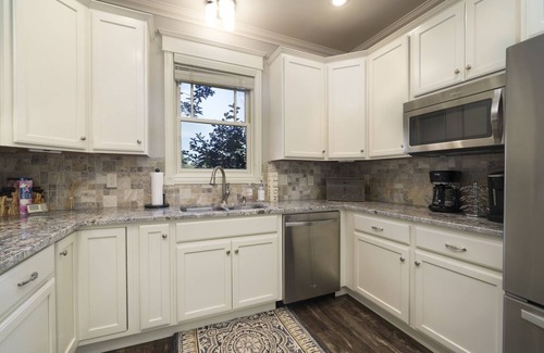 Kitchen: The fully stocked kitchen includes granite countertops, stainless steel appliances, and a 3-person breakfast bar. Guests will enjoy a dishwasher, microwave, and oven.