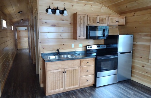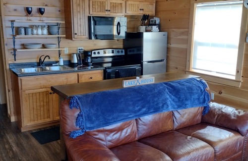 Say no to old musty dark cabins! This new lake house built in 2023 has all new furnishings. Queen bed in first bedroom with own thermostat for heat or A/C. Second bedroom has two twin beds. Both bedrooms have new mattresses. Fully functional kitchen with refrigerator, stove and oven. Washer and dryer in cabin. A/C and heat unit in master bedroom and living room/ kitchen. Electric heating unit in second bedroom.