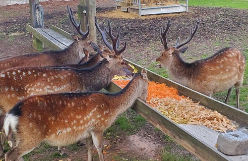 La maison est entourée d'un parc naturel privé de 9 hectares avec étangs ( pêche interdite )et cerfs sikas que vous pouvez facilement approcher et nourrir entièrement clôturé.