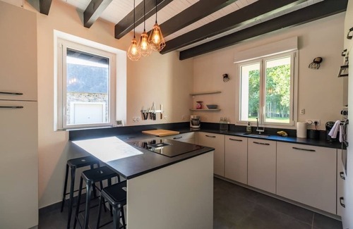 - Cuisine ouverte ultra équipée avec îlot central et tabourets