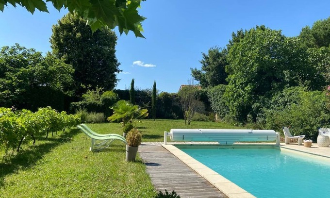 Dans une belle propriété paysagée avec piscine et terrasse.