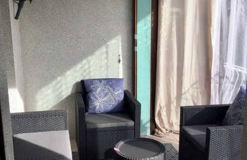 Jardin avec terrasse, balcon et logia, parasol et barbecue.