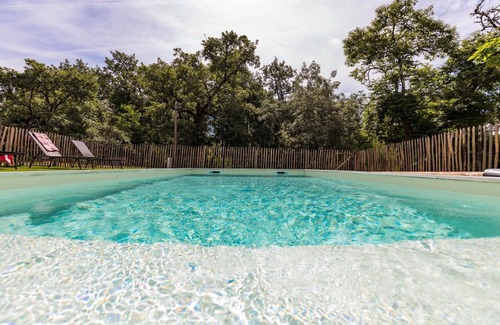 Baptiste SERIN, an international rugby union player playing for the Rugby Club Toulonnais and former player of Union-Bègles-Bordeaux, has carried out for you, with the help of his parents Marie-Pierre and Philippe, the renovation of a resin lodge in the middle of the forest in the Landes de Gascogne Natural Park on an area of 7600m², 3/4 of an hour from the coast. To relax, a private swimming pool (6.5m x 3.5m flat bottom 1.40m secured by a roller shutter) is at your disposal from June to September depending on the weather. A charming property, the Mordoit gîte offers 193 m² of living space spread over the ground floor and upper floor. The ground floor offers a spacious living room of 43 m² with equipped kitchen, microwave, dishwasher, electric oven, induction hob, fridge-freezer, open to living room and lounge with wood stove, sofa, armchairs, coffee table, TV, Wi-Fi, sound bar, washer-dryer 1 bedroom 13 m², 1 bed 160x200 cm, 1 bedroom 17 m², 1 bed 180x200 cm, child's bed, private bathroom in the bedroom, large shower tray, sink, 1 bedroom 16m², 1 bed 160x200 cm, lounge area with coffee table, toad armchairs, Bathroom with bathtub, separate toilet. The upper floor houses a spacious 81 m² dormitory, 1 bed 160x200 and 1 bed 140x190, and a surprising collection of more than 400 listed books! Relaxation areas and swing under a frame making the place very cocooning. A 100 m² barn completes the house declined in games room, with ping-pong and piano, summer kitchen. Shower room in annex with shower and toilet. You will enjoy the very exotic forest environment with bowling alley, swings, terrace (garden furniture, barbecue) overlooking a magnificent private pond on the edge of the maintained and flowered property. For your comfort, bed linen, household linen provided. Wood for stove 50 € / wheelbarrow. Charm, calm and serenity characterize this place lulled by the field of birds and the surrounding forest!