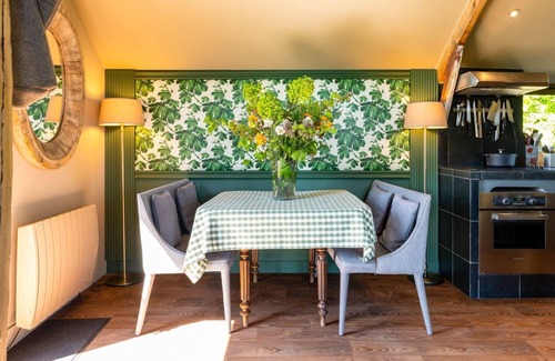 Ground Floor (with the occasional step)- Partially open-plan lounge with wood stove and doors opening out to garden - Open-plan dining area and kitchen, well-equipped including dishwasher, fridge, microwave, oven, coffee machine, kettle, mixer and dining table for 4-6 guests (can also be used as office space). Door leads to al-fresco dining terrace - Bedroom with double bed, meadow view and private shower room- Bedroom with double bed, garden view and private shower room