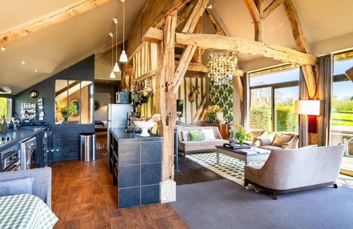 The glorious garden is beautifully maintained with white roses, box hedges and lawns which you can admire from the terrace with outdoor sofas, an al-fresco dining table and gas barbecue. As you sit back in the hot tub you can gaze out to the meadow.