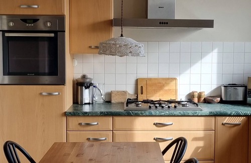 The kitchen is equipped with an oven, a stovetop, and a refrigerator, as well as a coffee maker, an electric kettle, and a microwave. Bathroom amenities include a hair dryer and toilet paper. And because there's access to laundry facilities, you can go a bit lighter on your packing. Other amenities include bed sheets, a desk, an ironing board, and heating.