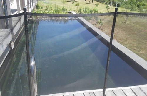 Swimming pool with natural water filter and a dishwasher and yellow iris; equipped with a removable fence