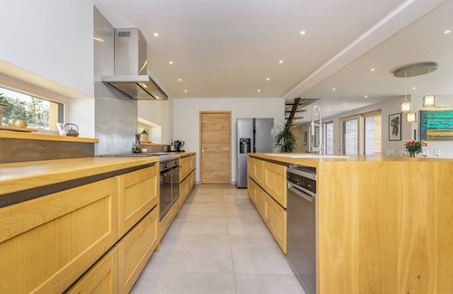 The interior is bright and spacious, with tall glass windows and stylish wooden panels. In the living room you will find furniture with an exclusive design. The open kitchen is entirely handmade by the owner who also designed the house himself.