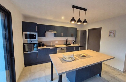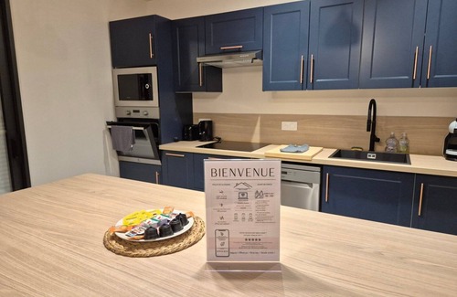 -> A dining area with a fully equipped kitchen (stove, extractor hood, microwave, oven, fridge, freezer, dishwasher, toaster, Dolce Gusto coffee machine, kettle, etc.). Everything you need to cook is provided. A welcome kit is offered, including tea, coffee, sugar, and biscuits.