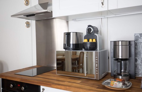 • Fridge with freezer compartment, ceramic hob, oven, microwave, dishwasher, filter and capsule coffee makers (Nespresso), kettle, toaster, crockery and cooking utensils. Coffee, filter, Nespresso capsules, tea, sugar, salt and pepper provided.