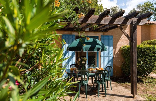 This maisonette is located on the green vacation park Les Mazets de Gaujac. The property is located on a slope 100 m from the center of the Provencal village of Gaujac. A large 'Intermarché' supermarket is nearby. Other stores can be found in the village of Connaux at about 2.5 km. This maisonette is neatly and colorfully decorated in Provencal style and features a living room with a double sofa bed and a TV. The kitchen is equipped with a refrigerator, two electric hotplates, a mini-oven + microwave and a coffee maker. In addition, the maisonette has a bedroom with a double bed and a bathroom with shower or bathtub and toilet. All maisonettes have air conditioning/heating and a terrace with garden furniture. One parking space is available per apartment. In Les Mazets de Gaujac you can book various semi-detached maisonnettes for two to seven people.